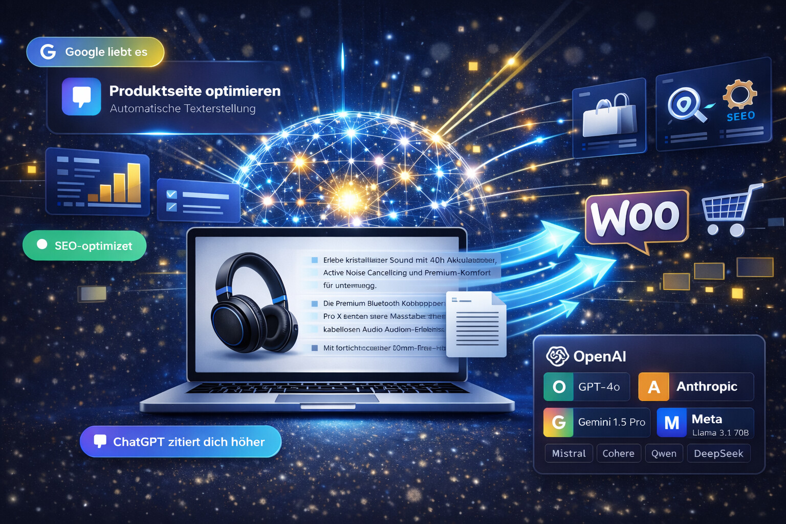 Automatische Produktbeschreibungen für WooCommerce – powered by GPT-4, Claude, Gemini & mehr. Verwandle Tausende Produkte in verkaufsstarke Texte mit einem Klick – und das SEO & LLM optimiert!